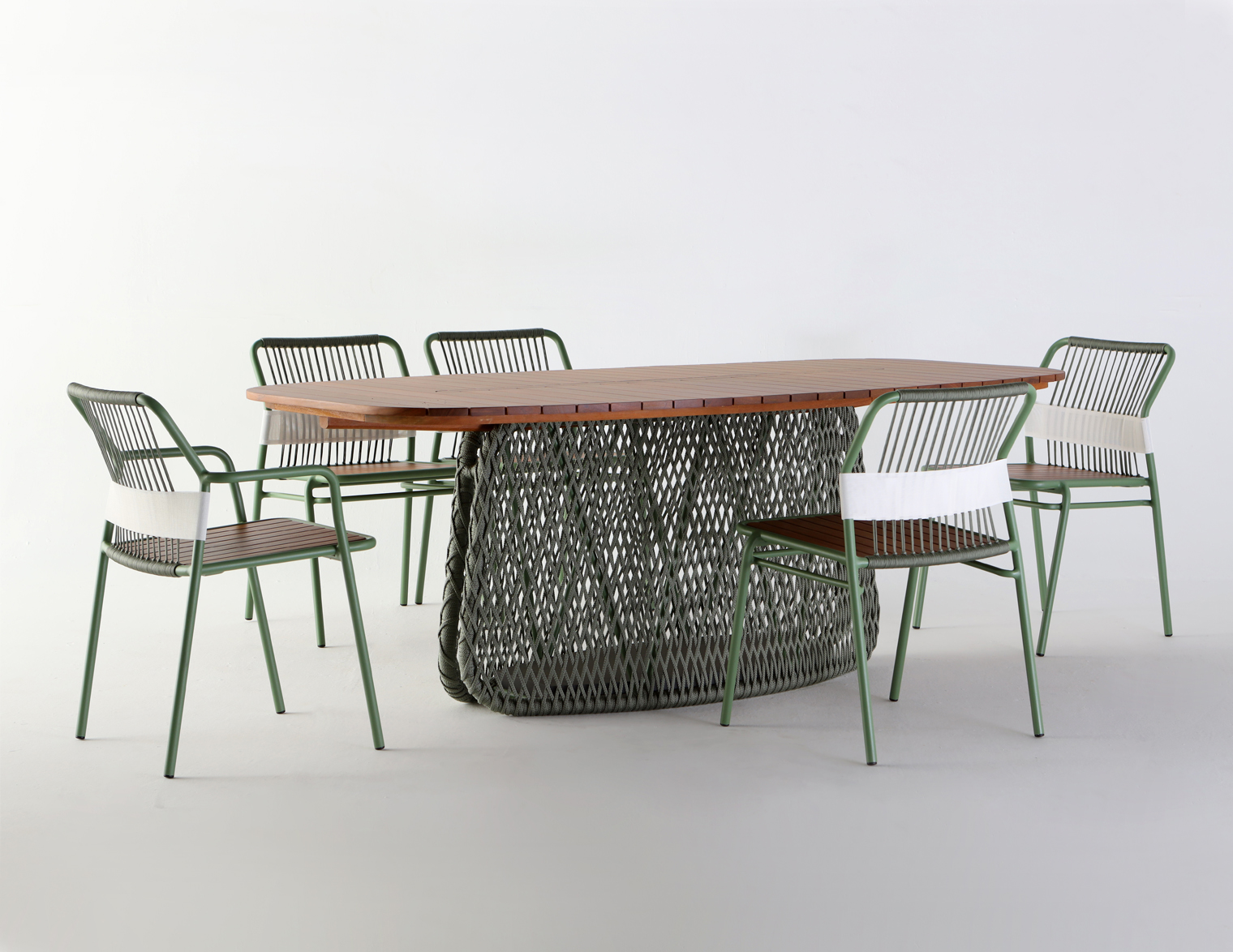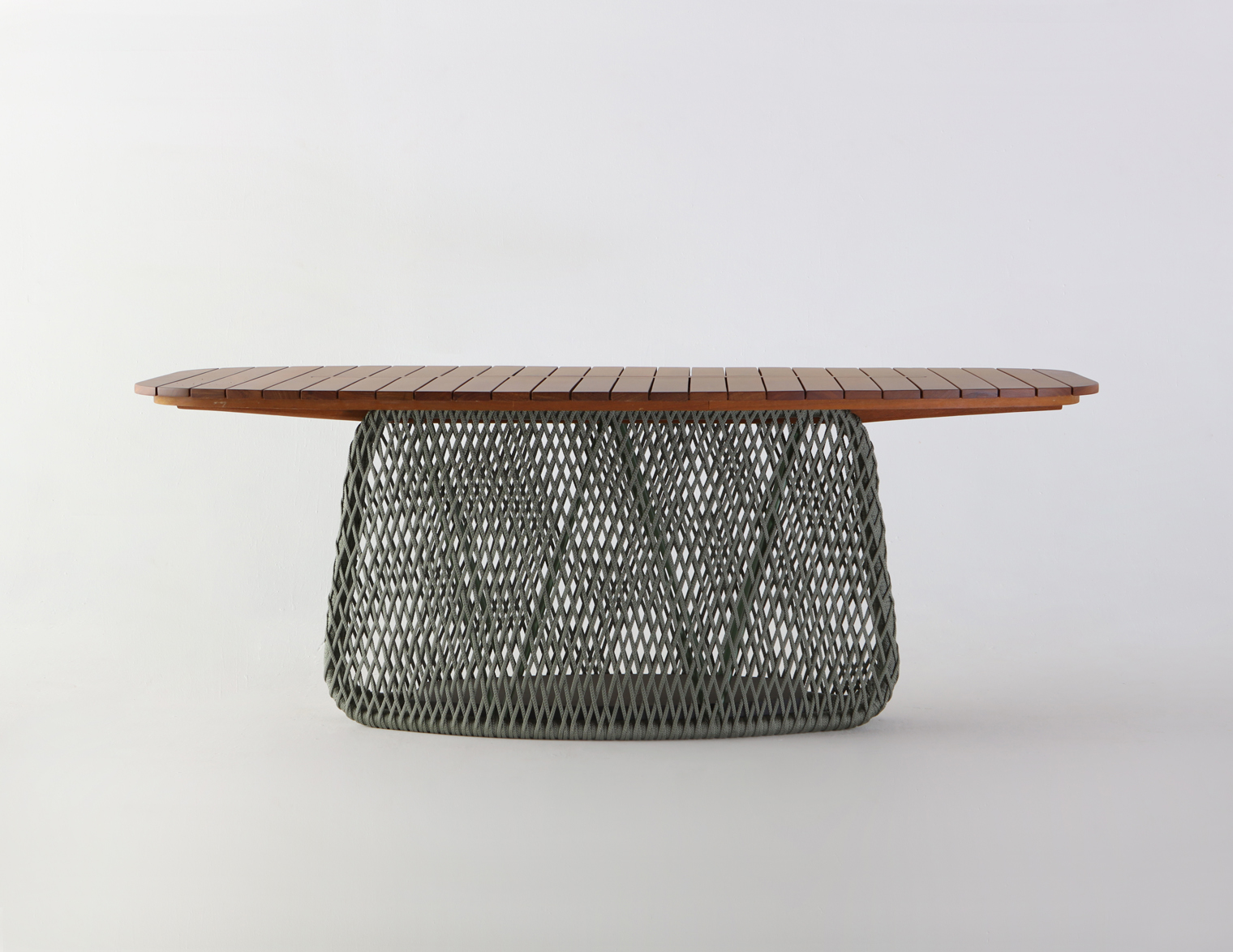 Estrutura em alumínio revestida em corda náutica, tampo em madeira.